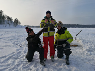 When fellow students come to spend a weekend, it can not be just lounging. There are many things to do: construction of stairway, burning of brushwood, ice fishing and, of course, ice swimming! This time the hole on ice for swimming was de luxe in size and style.
